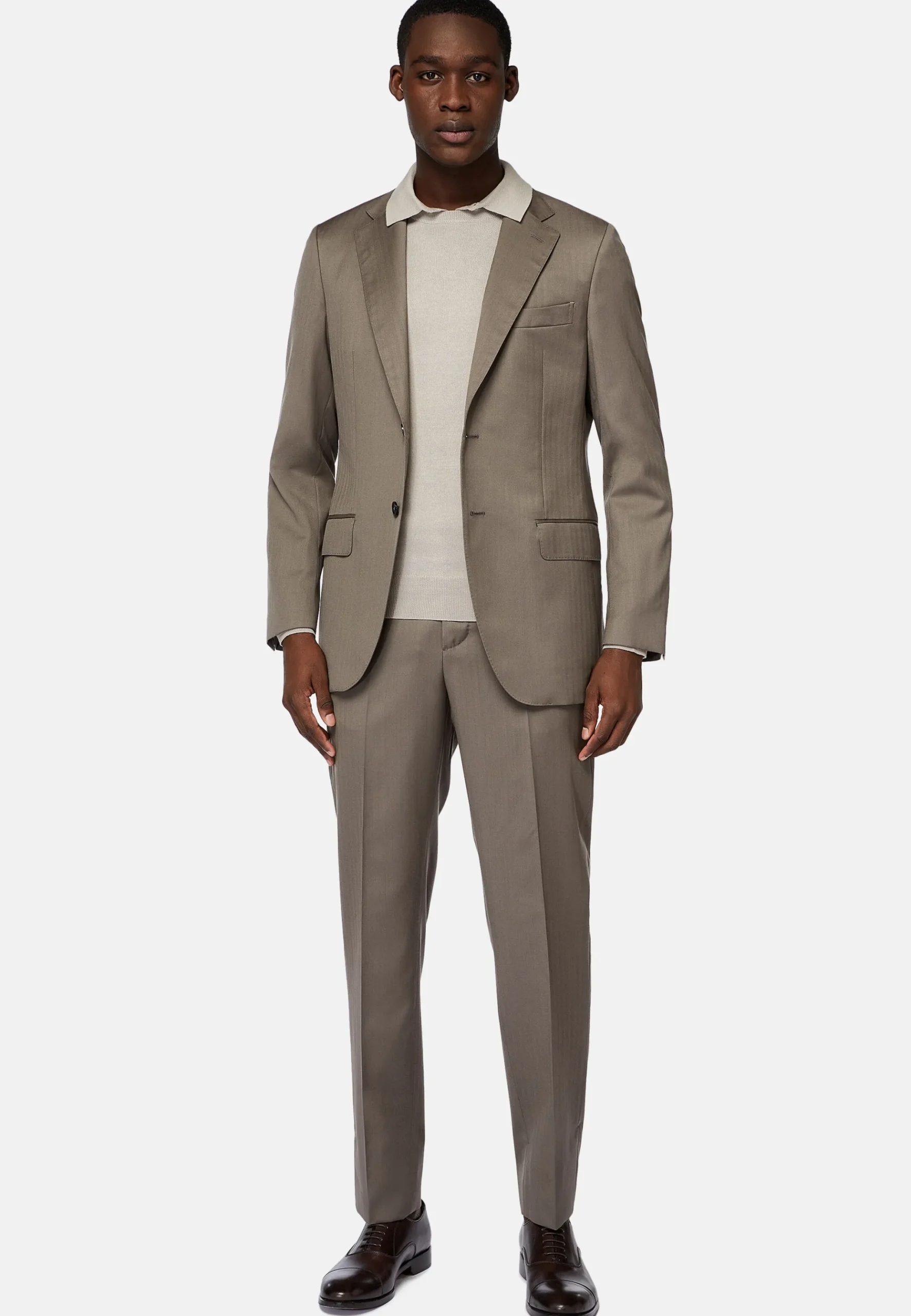 Costume coupe droite, confection semi-entoilée, à simple boutonnage, entièrement doublé avec poches à rabat.