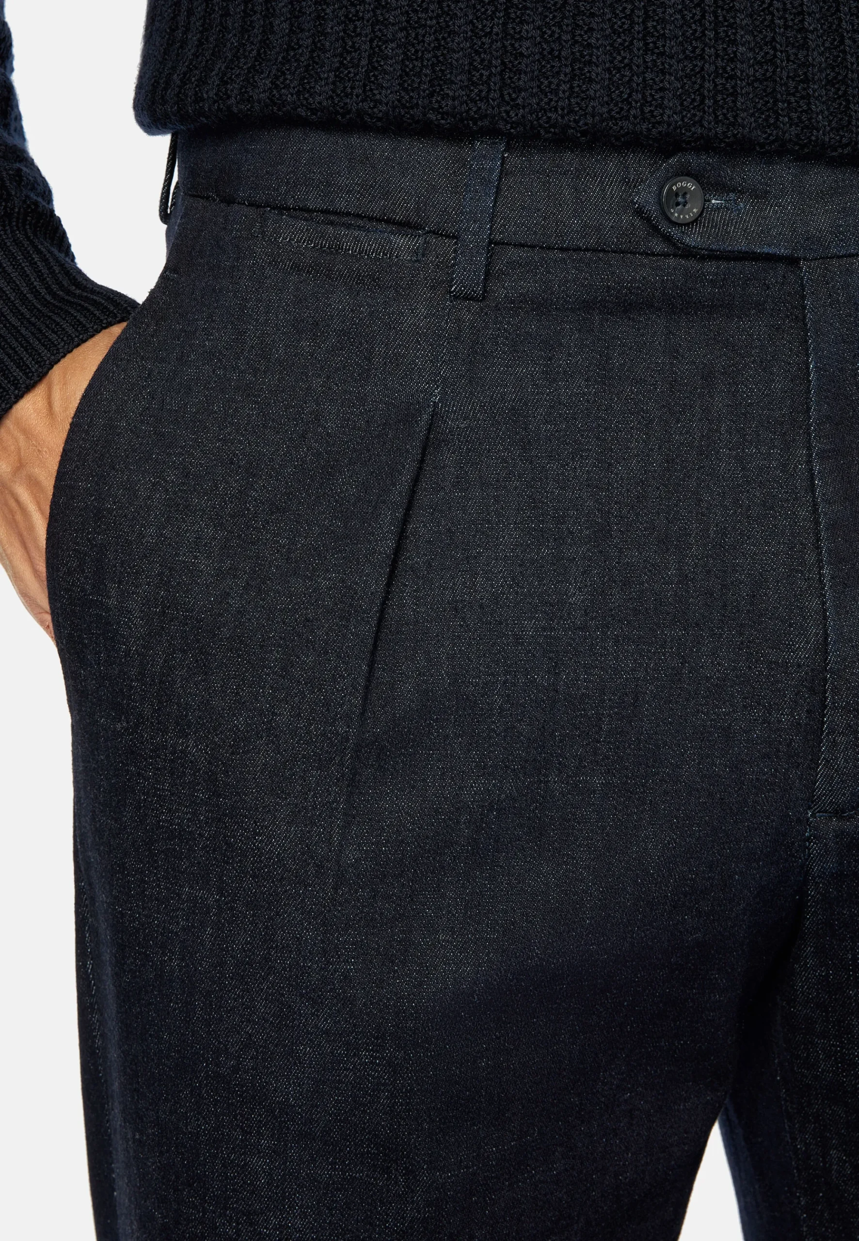 Fermeture par bouton et zip, avec poches avant dans la couture et poches arrière.
