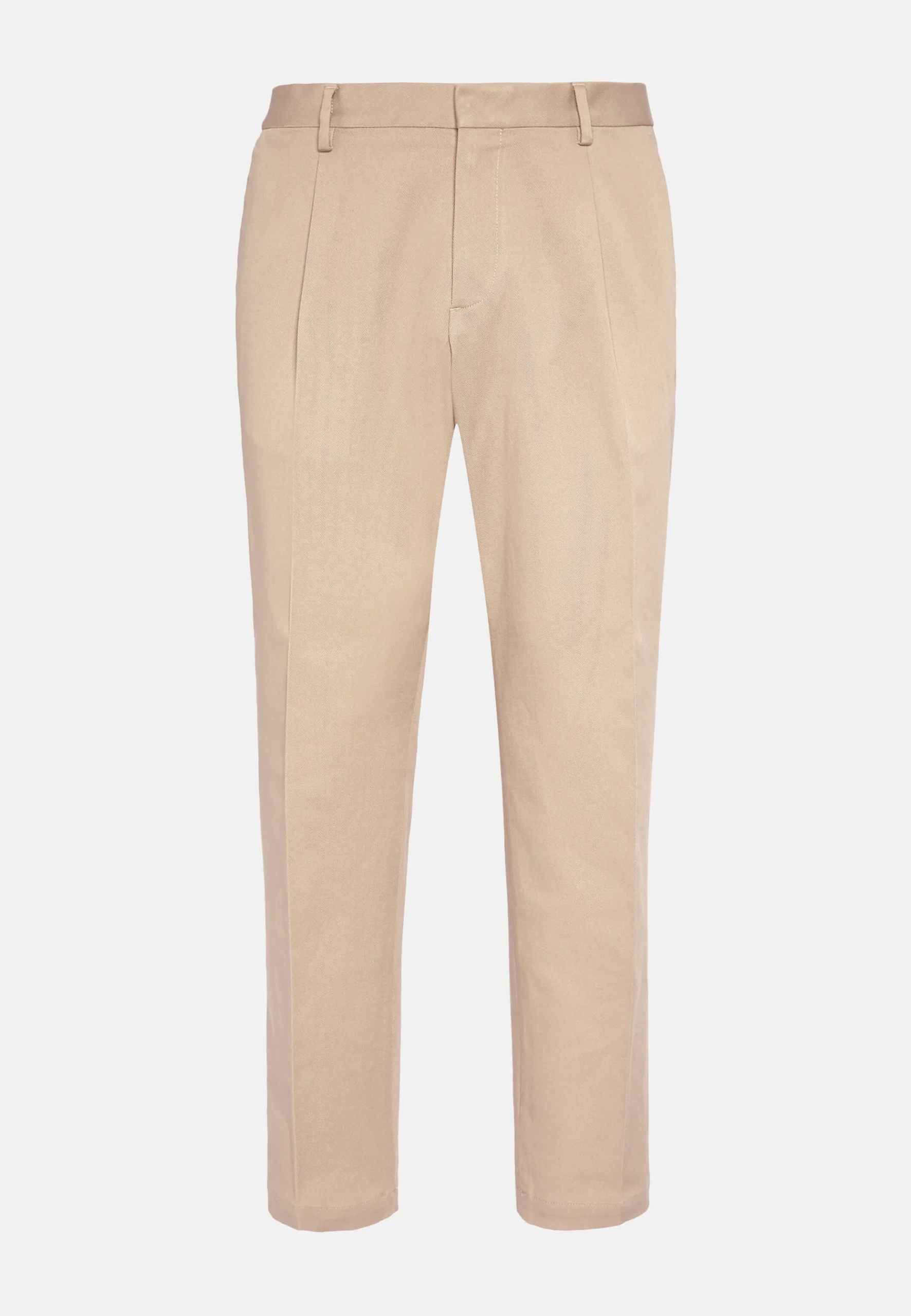 Fermeture avec bouton et zip, poches avant en biais et poches arrière.
