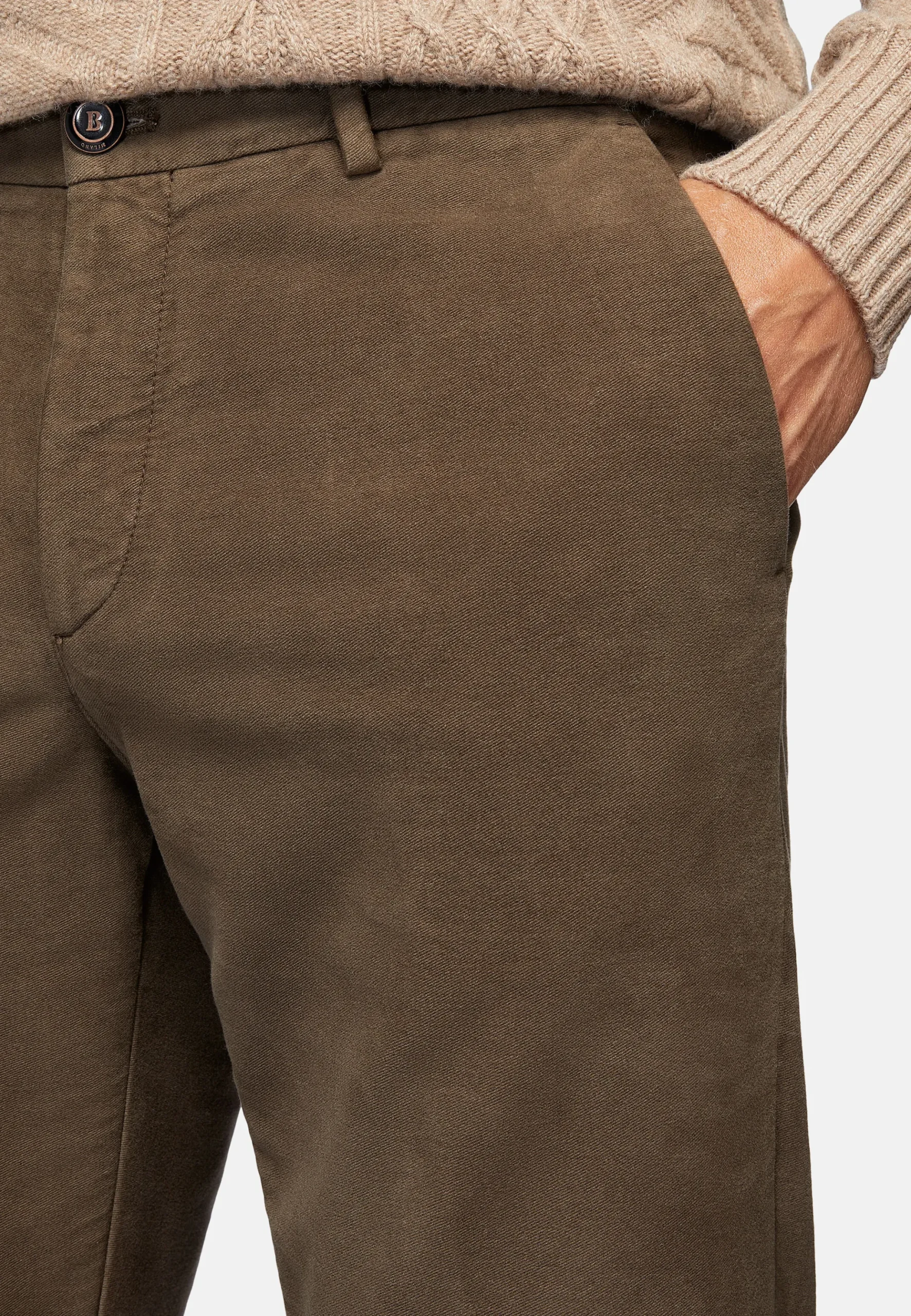 Fermeture avec bouton et zip, poches avant en biais et poches arrière.