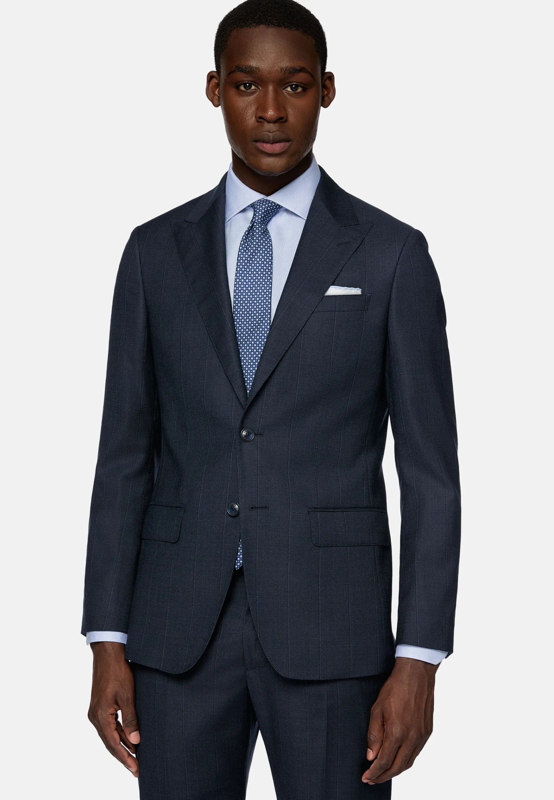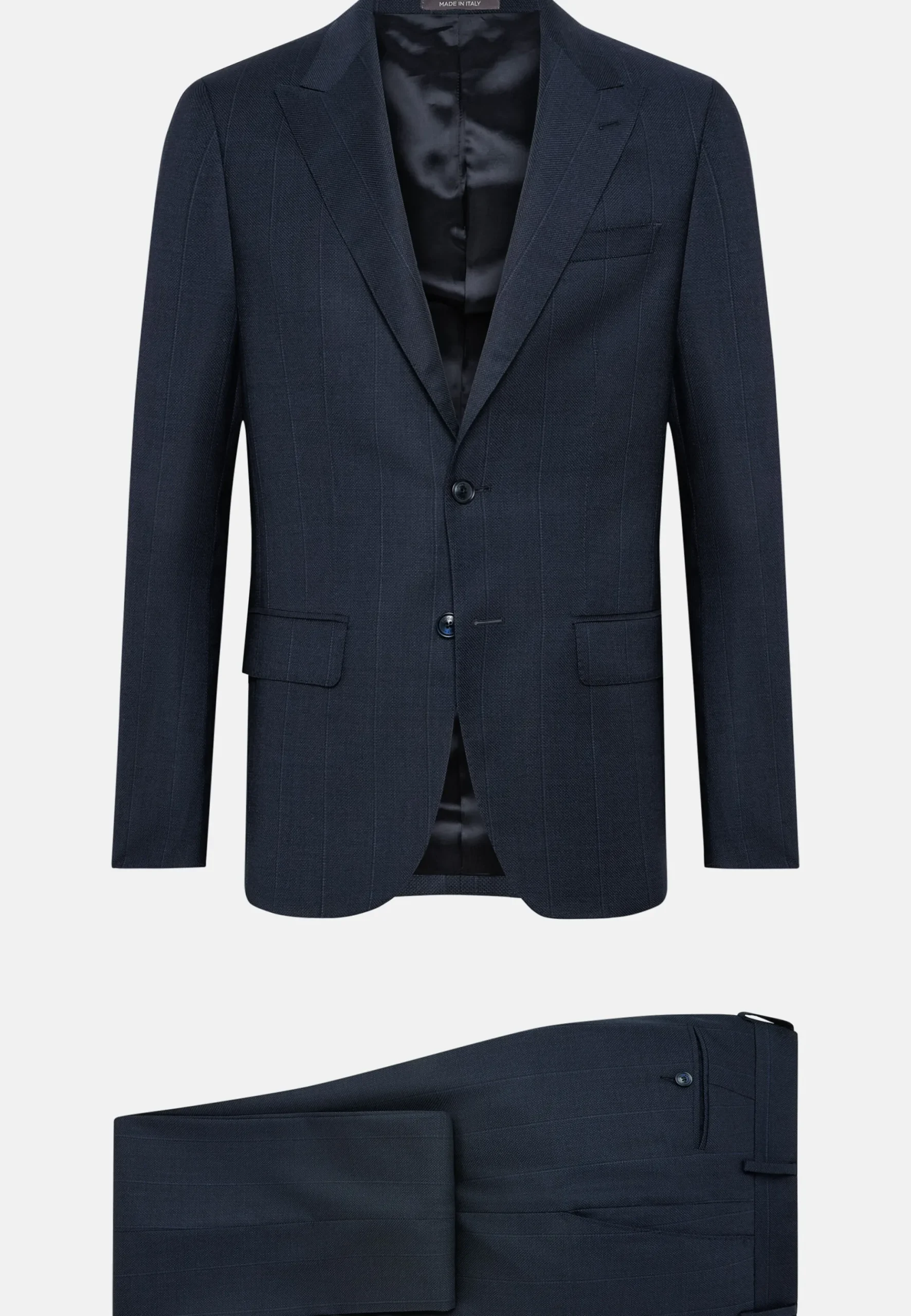 Costume slim fit semi-entoilé, à simple boutonnage, revers en pointe, entièrement doublé avec poches à rabat.