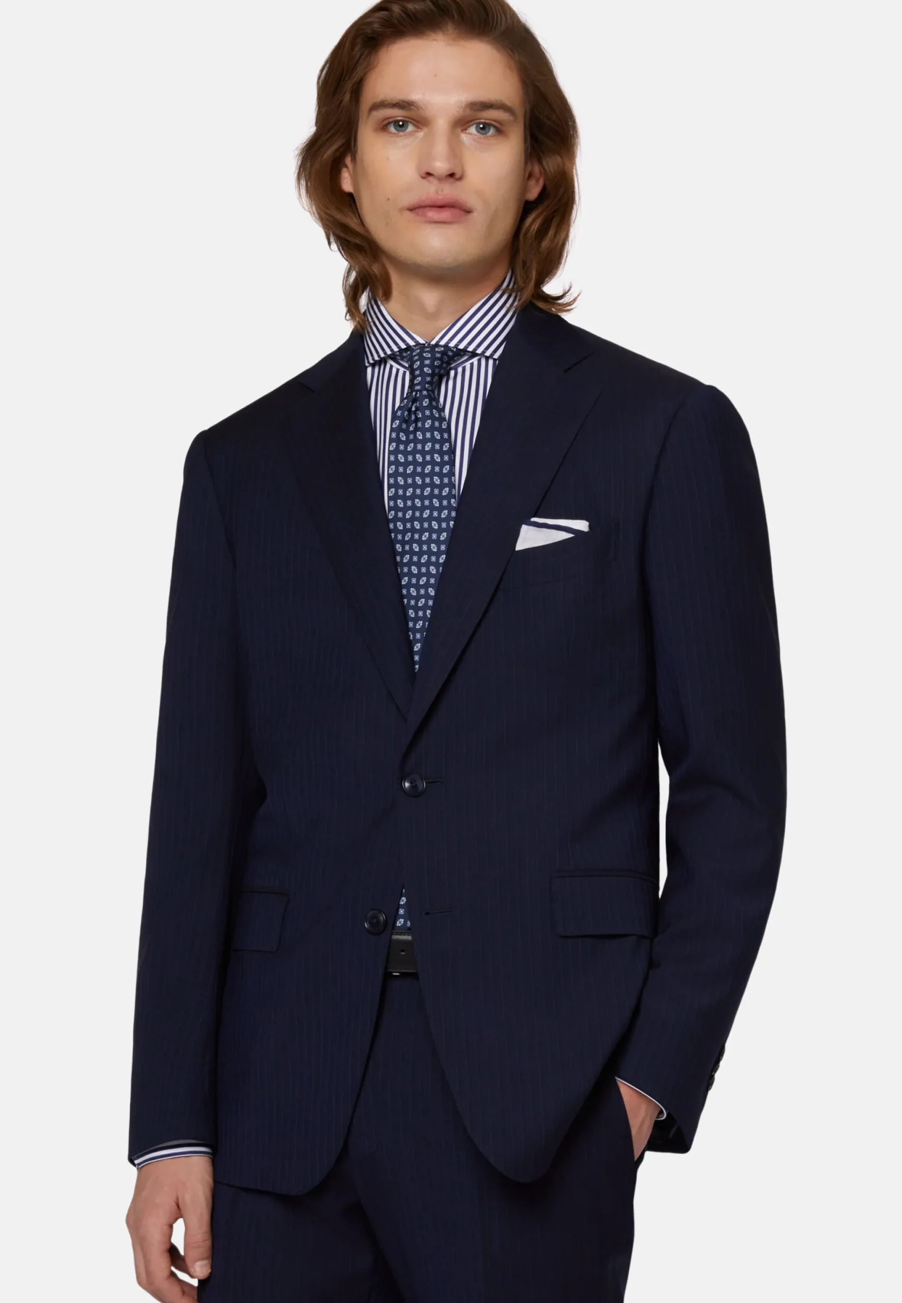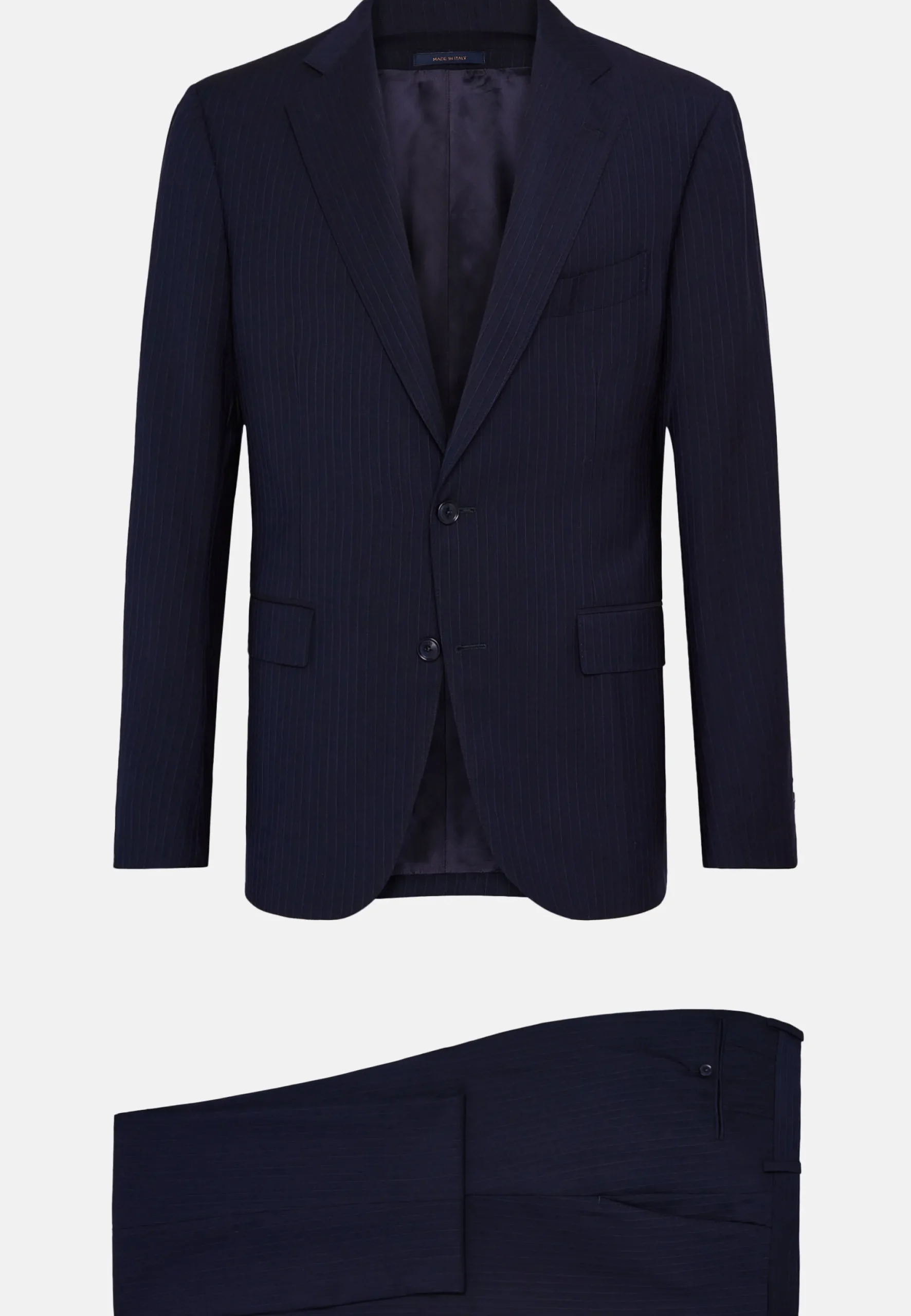 Costume coupe droite, construction entoilée, à simple boutonnage, entièrement doublé avec poches à rabat.