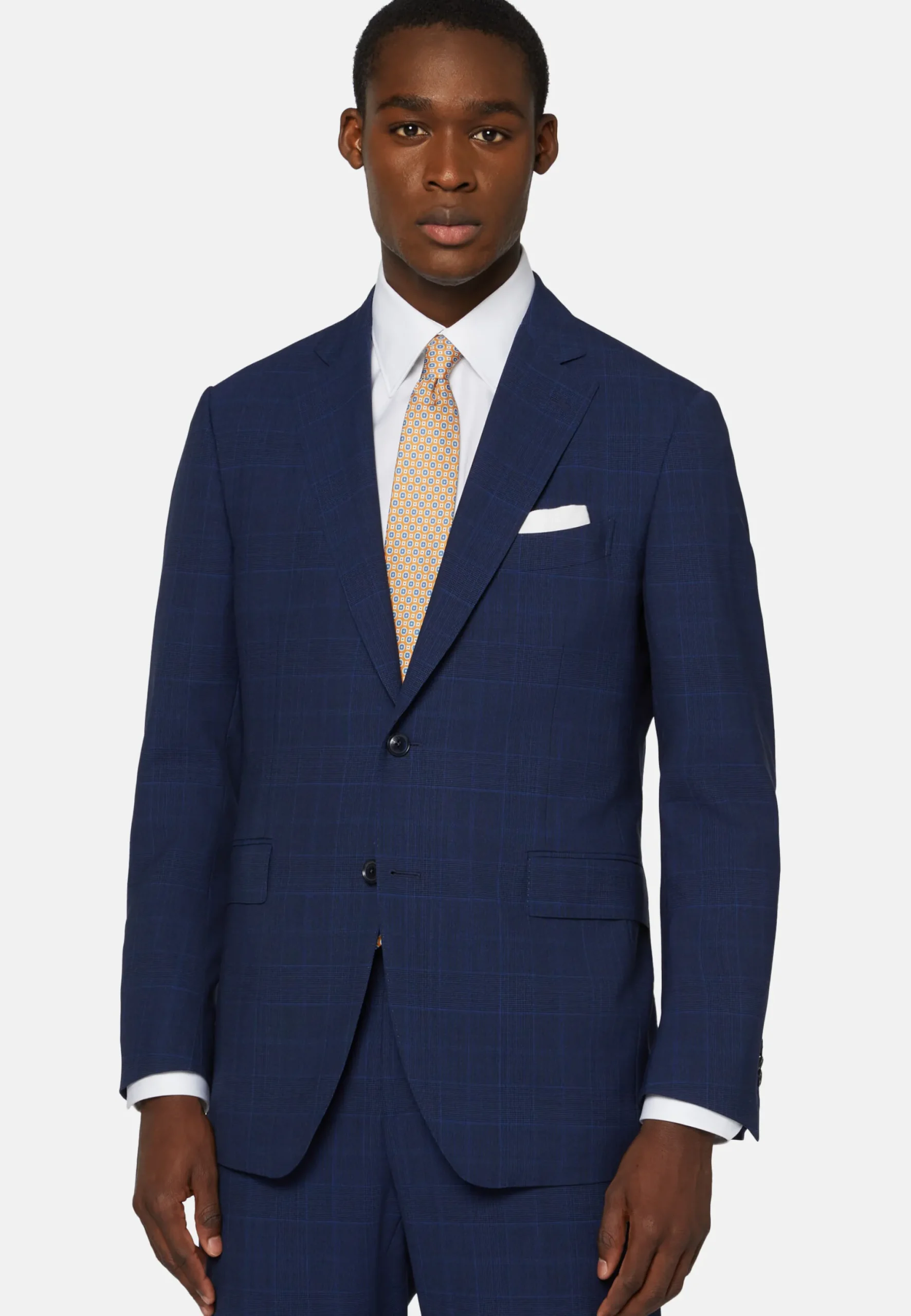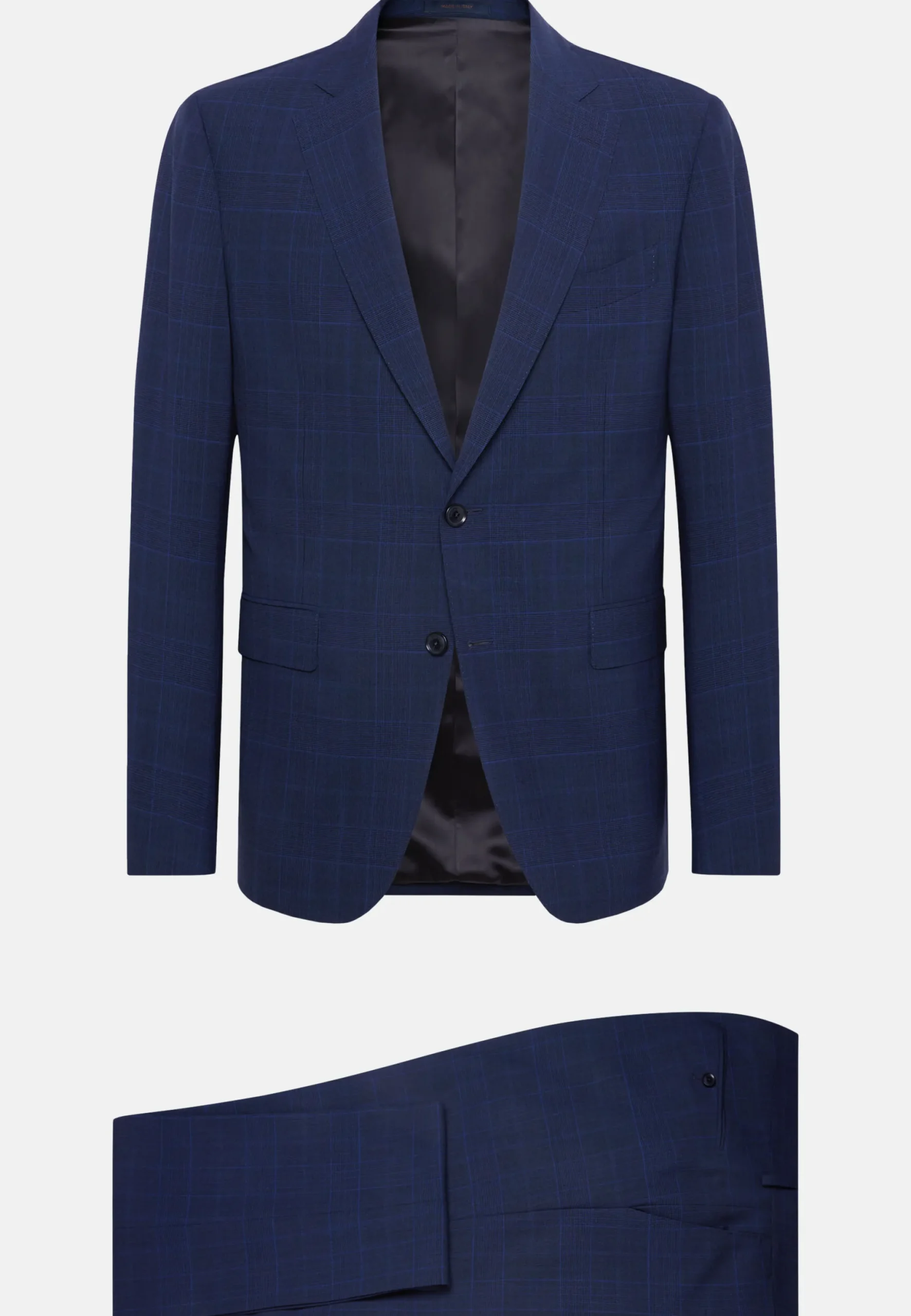Costume coupe classique avec construction entoilée, simple boutonnage, entièrement doublé avec poches à rabat.