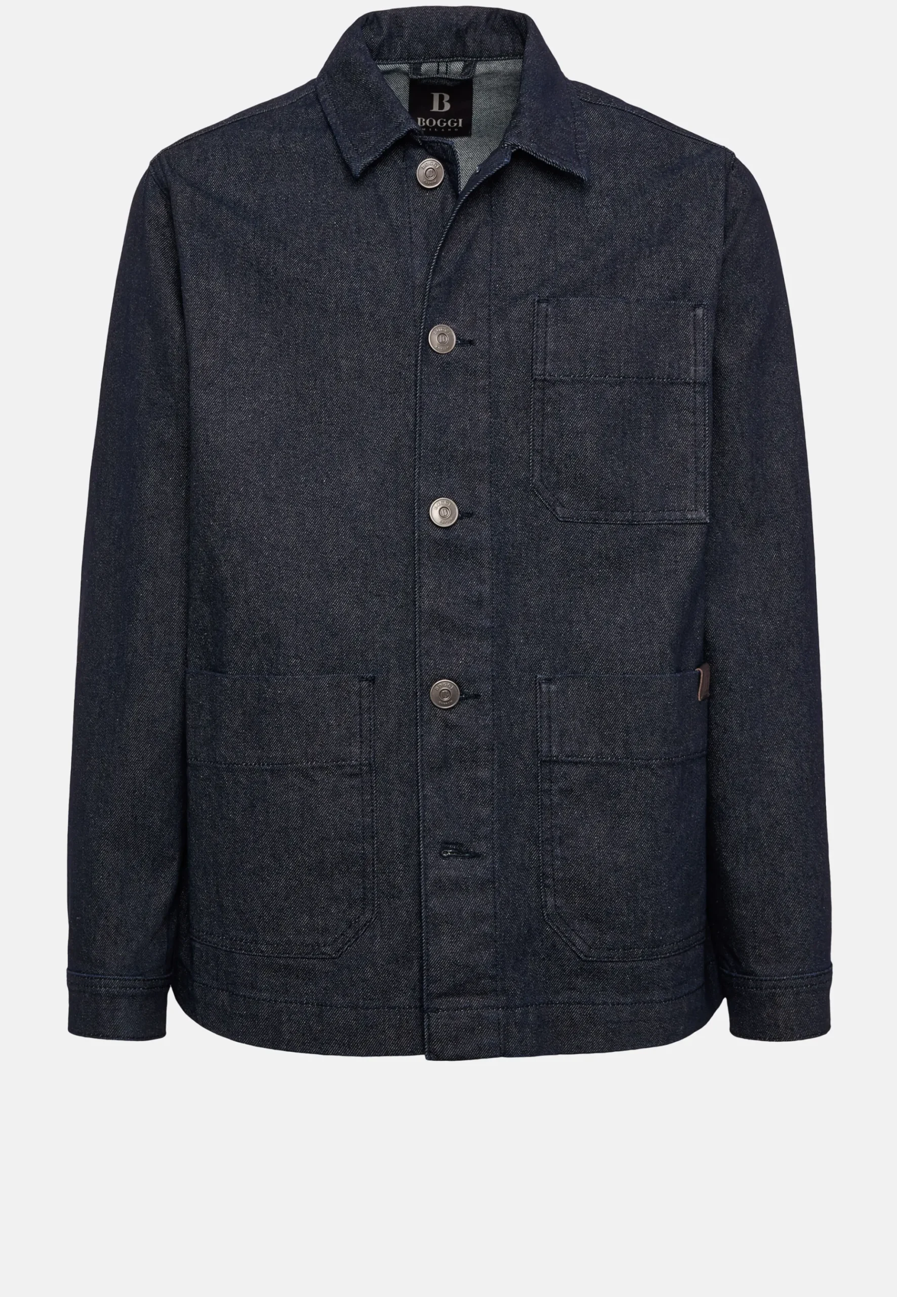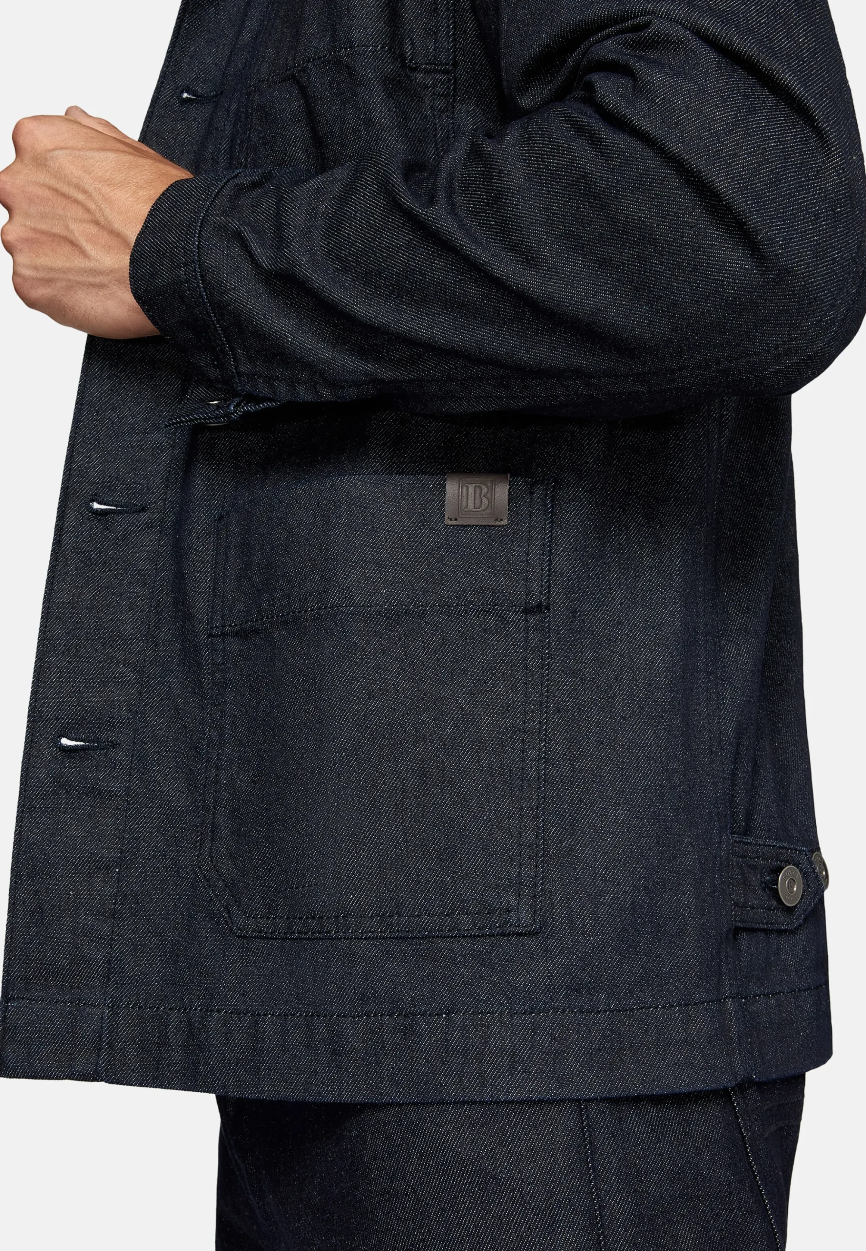 Emblème en cuir avec logo sur la poche inférieure gauche.
